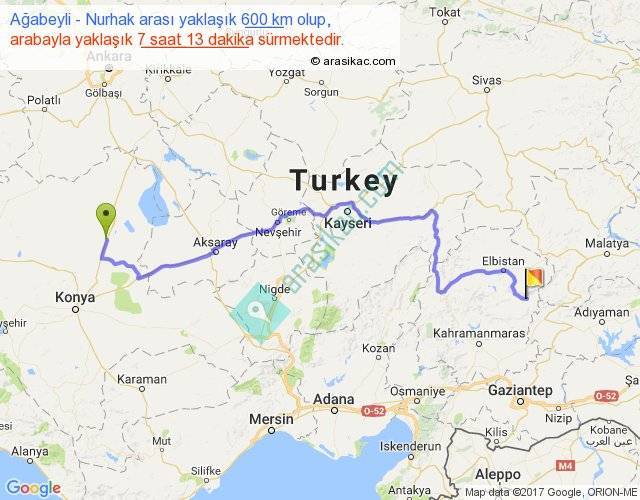 Ağabeyli - Nurhak arası yaklaşık olarak 90 km/h ile yukarıda belirtilen sürede olup, iki yerin kuş uçuşu uzaklığı (mesafesi) 405'dir. Eğer belirtilen yerler arasında uçak seferi var ise bu süre uçakla 37 dakika'ya kadar düşebilir. Yolculuk otobüsle 9 saat 22 dakika sürmektedir.