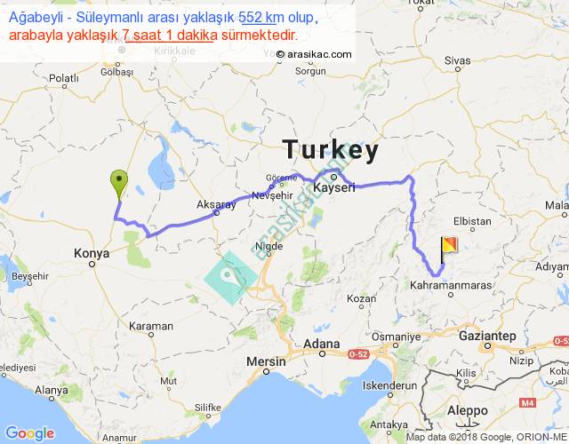 Ağabeyli - Süleymanlı arası yaklaşık olarak 90 km/h ile yukarıda belirtilen sürede olup, iki yerin kuş uçuşu uzaklığı (mesafesi) 353'dir. Eğer belirtilen yerler arasında uçak seferi var ise bu süre uçakla 32 dakika'ya kadar düşebilir. Yolculuk otobüsle 9 saat 7 dakika sürmektedir.