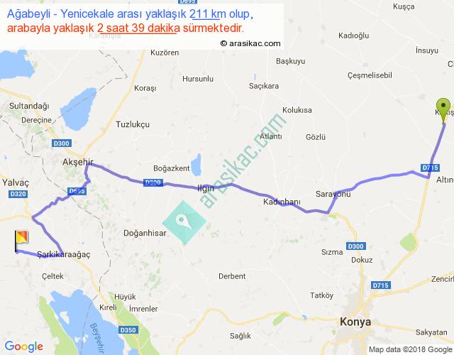 Ağabeyli - Yenicekale arası yaklaşık olarak 90 km/h ile yukarıda belirtilen sürede olup, iki yerin kuş uçuşu uzaklığı (mesafesi) 150'dir. Yolculuk otobüsle 3 saat 26 dakika sürmektedir.