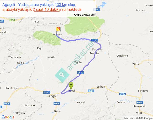 Ağaçeli - Yedisu arası yaklaşık olarak 90 km/h ile yukarıda belirtilen sürede olup, iki yerin kuş uçuşu uzaklığı (mesafesi) 57'dir. Yolculuk otobüsle 2 saat 49 dakika sürmektedir.