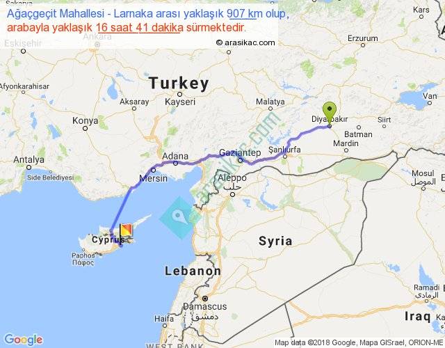 Ağaçgeçit Mahallesi - Larnaka arası yaklaşık olarak 90 km/h ile yukarıda belirtilen sürede olup, iki yerin kuş uçuşu uzaklığı (mesafesi) 672'dir. Eğer belirtilen yerler arasında uçak seferi var ise bu süre uçakla 1 saat 02 dakika'ya kadar düşebilir. Yolculuk otobüsle 21 saat 41 dakika sürmektedir.
