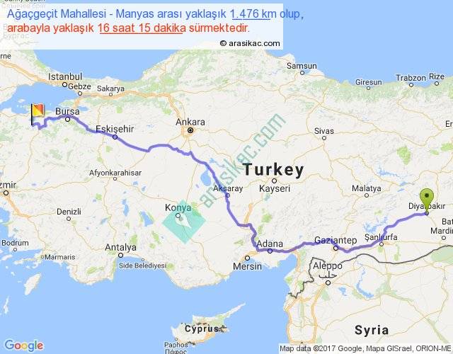 Ağaçgeçit Mahallesi - Manyas arası yaklaşık olarak 90 km/h ile yukarıda belirtilen sürede olup, iki yerin kuş uçuşu uzaklığı (mesafesi) 1077'dir. Eğer belirtilen yerler arasında uçak seferi var ise bu süre uçakla 1 saat 39 dakika'ya kadar düşebilir. Yolculuk otobüsle 21 saat 7 dakika sürmektedir.