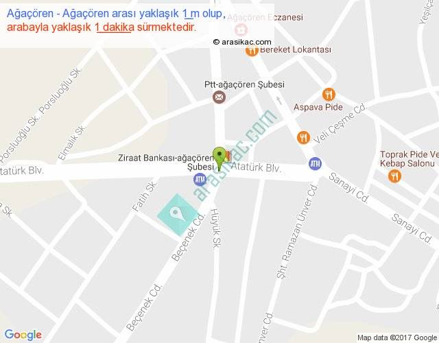 Ağaçören - Ağaçören arası yaklaşık olarak 90 km/h ile yukarıda belirtilen sürede olup, iki yerin kuş uçuşu uzaklığı (mesafesi) 0'dir. Yolculuk otobüsle 1 dakika sürmektedir.