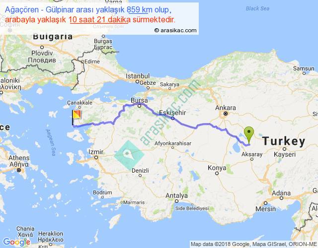 Ağaçören - Gülpinar arası yaklaşık olarak 90 km/h ile yukarıda belirtilen sürede olup, iki yerin kuş uçuşu uzaklığı (mesafesi) 672'dir. Eğer belirtilen yerler arasında uçak seferi var ise bu süre uçakla 1 saat 02 dakika'ya kadar düşebilir. Yolculuk otobüsle 13 saat 27 dakika sürmektedir.