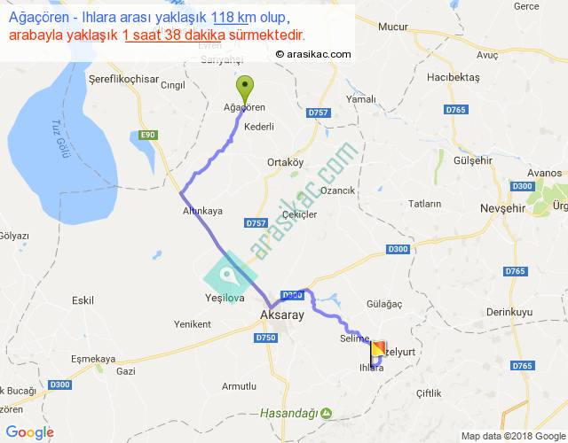 Ağaçören - Ihlara arası yaklaşık olarak 90 km/h ile yukarıda belirtilen sürede olup, iki yerin kuş uçuşu uzaklığı (mesafesi) 78'dir. Yolculuk otobüsle 2 saat 7 dakika sürmektedir.