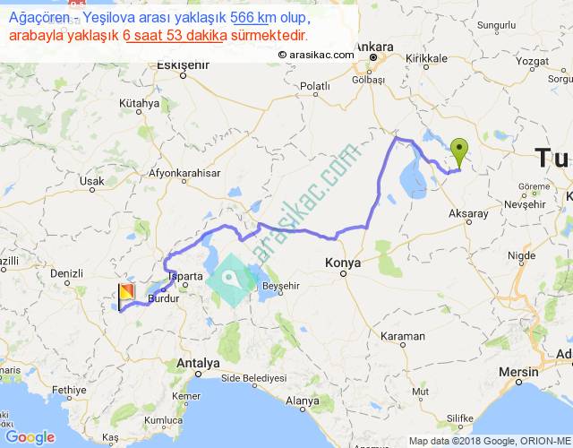 Ağaçören - Yeşilova arası yaklaşık olarak 90 km/h ile yukarıda belirtilen sürede olup, iki yerin kuş uçuşu uzaklığı (mesafesi) 392'dir. Eğer belirtilen yerler arasında uçak seferi var ise bu süre uçakla 36 dakika'ya kadar düşebilir. Yolculuk otobüsle 8 saat 56 dakika sürmektedir.