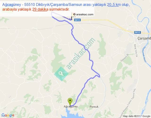 Ağcagüney - 55510 Dikbıyık Çarşamba Samsun arası yaklaşık olarak 90 km/h ile yukarıda belirtilen sürede olup, iki yerin kuş uçuşu uzaklığı (mesafesi) 11'dir. Yolculuk otobüsle 37 dakika sürmektedir.