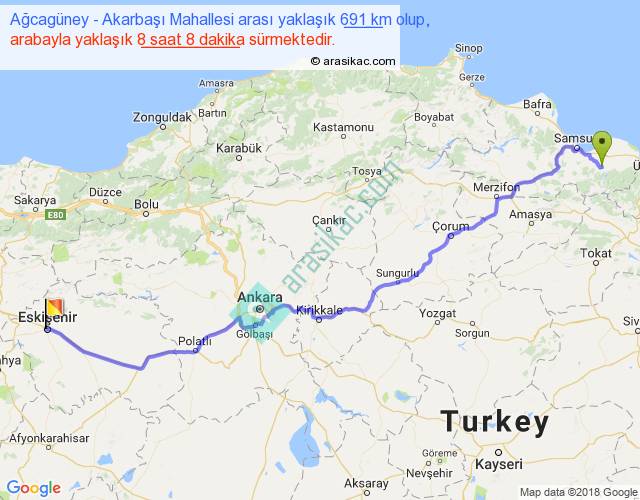 Ağcagüney - Akarbaşı Mahallesi arası yaklaşık olarak 90 km/h ile yukarıda belirtilen sürede olup, iki yerin kuş uçuşu uzaklığı (mesafesi) 534'dir. Eğer belirtilen yerler arasında uçak seferi var ise bu süre uçakla 49 dakika'ya kadar düşebilir. Yolculuk otobüsle 10 saat 34 dakika sürmektedir.