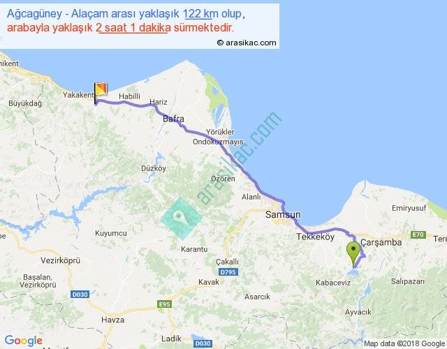 Ağcagüney - Alaçam arası yaklaşık olarak 90 km/h ile yukarıda belirtilen sürede olup, iki yerin kuş uçuşu uzaklığı (mesafesi) 99'dir. Yolculuk otobüsle 2 saat 37 dakika sürmektedir.