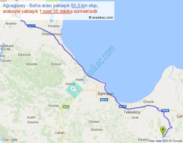 Ağcagüney - Bafra arası yaklaşık olarak 90 km/h ile yukarıda belirtilen sürede olup, iki yerin kuş uçuşu uzaklığı (mesafesi) 76'dir. Yolculuk otobüsle 2 saat 3 dakika sürmektedir.
