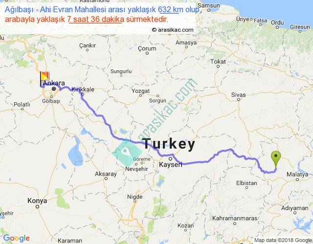 Ağılbaşı - Ahi Evran Mahallesi arası yaklaşık olarak 90 km/h ile yukarıda belirtilen sürede olup, iki yerin kuş uçuşu uzaklığı (mesafesi) 478'dir. Eğer belirtilen yerler arasında uçak seferi var ise bu süre uçakla 44 dakika'ya kadar düşebilir. Yolculuk otobüsle 9 saat 52 dakika sürmektedir.