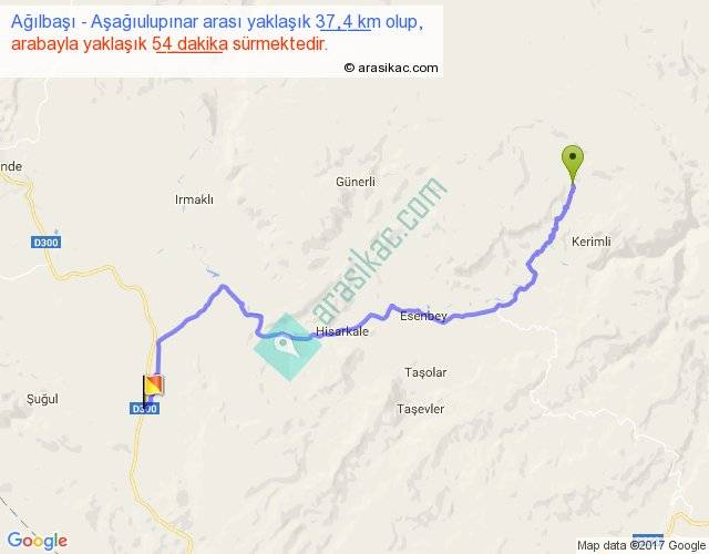 Ağılbaşı - Aşağıulupınar arası yaklaşık olarak 90 km/h ile yukarıda belirtilen sürede olup, iki yerin kuş uçuşu uzaklığı (mesafesi) 26'dir. Yolculuk otobüsle 1 saat 10 dakika sürmektedir.