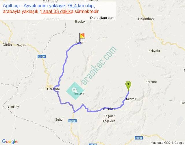 Ağılbaşı - Ayvalı arası yaklaşık olarak 90 km/h ile yukarıda belirtilen sürede olup, iki yerin kuş uçuşu uzaklığı (mesafesi) 28'dir. Yolculuk otobüsle 2 saat 0 dakika sürmektedir.