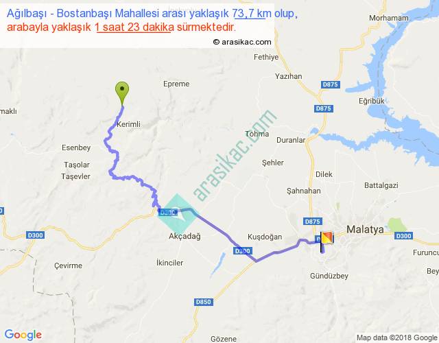 Ağılbaşı - Bostanbaşı Mahallesi arası yaklaşık olarak 90 km/h ile yukarıda belirtilen sürede olup, iki yerin kuş uçuşu uzaklığı (mesafesi) 43'dir. Yolculuk otobüsle 1 saat 47 dakika sürmektedir.