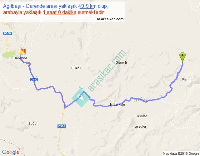 Ağılbaşı - Darende arası yaklaşık olarak 90 km/h ile yukarıda belirtilen sürede olup, iki yerin kuş uçuşu uzaklığı (mesafesi) 31'dir. Yolculuk otobüsle 1 saat 18 dakika sürmektedir.