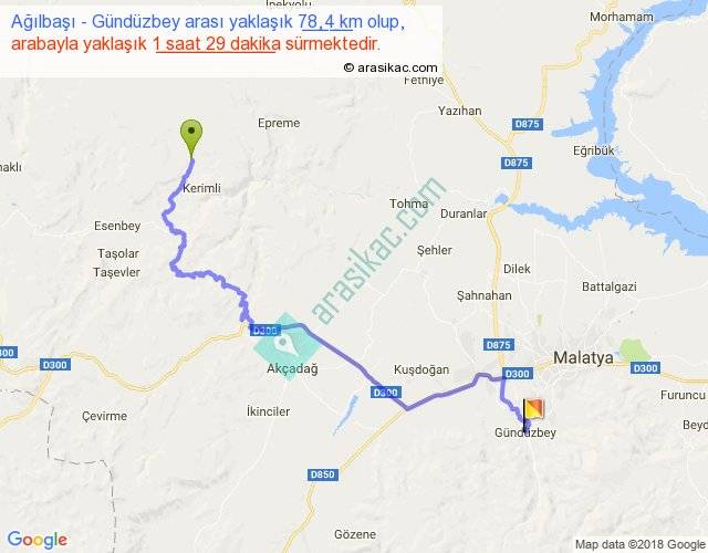 Ağılbaşı - Gündüzbey arası yaklaşık olarak 90 km/h ile yukarıda belirtilen sürede olup, iki yerin kuş uçuşu uzaklığı (mesafesi) 46'dir. Yolculuk otobüsle 1 saat 55 dakika sürmektedir.