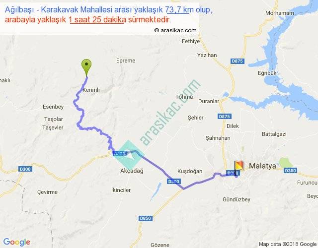 Ağılbaşı - Karakavak Mahallesi arası yaklaşık olarak 90 km/h ile yukarıda belirtilen sürede olup, iki yerin kuş uçuşu uzaklığı (mesafesi) 43'dir. Yolculuk otobüsle 1 saat 50 dakika sürmektedir.