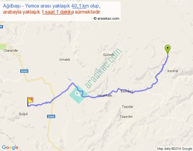 Ağılbaşı - Yenice arası yaklaşık olarak 90 km/h ile yukarıda belirtilen sürede olup, iki yerin kuş uçuşu uzaklığı (mesafesi) 29'dir. Yolculuk otobüsle 1 saat 19 dakika sürmektedir.