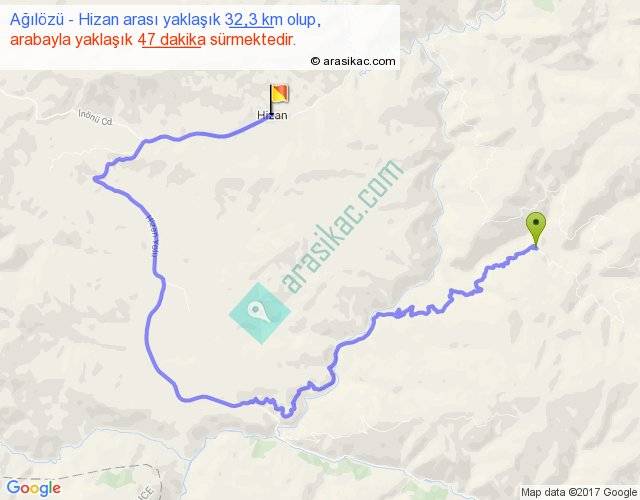 Ağılözü - Hizan arası yaklaşık olarak 90 km/h ile yukarıda belirtilen sürede olup, iki yerin kuş uçuşu uzaklığı (mesafesi) 9'dir. Yolculuk otobüsle 1 saat 1 dakika sürmektedir.