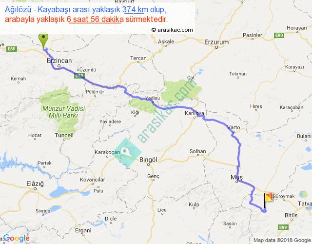 Ağılözü - Kayabaşı arası yaklaşık olarak 90 km/h ile yukarıda belirtilen sürede olup, iki yerin kuş uçuşu uzaklığı (mesafesi) 263'dir. Eğer belirtilen yerler arasında uçak seferi var ise bu süre uçakla 24 dakika'ya kadar düşebilir. Yolculuk otobüsle 9 saat 0 dakika sürmektedir.