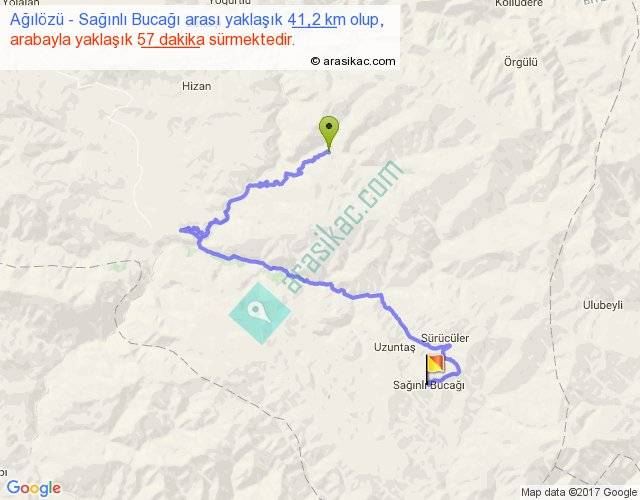 Ağılözü - Sağınlı Bucağı arası yaklaşık olarak 90 km/h ile yukarıda belirtilen sürede olup, iki yerin kuş uçuşu uzaklığı (mesafesi) 15'dir. Yolculuk otobüsle 1 saat 14 dakika sürmektedir.