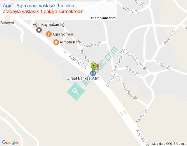 Ağın - Ağın arası yaklaşık olarak 90 km/h ile yukarıda belirtilen sürede olup, iki yerin kuş uçuşu uzaklığı (mesafesi) 0'dir. Yolculuk otobüsle 1 dakika sürmektedir.