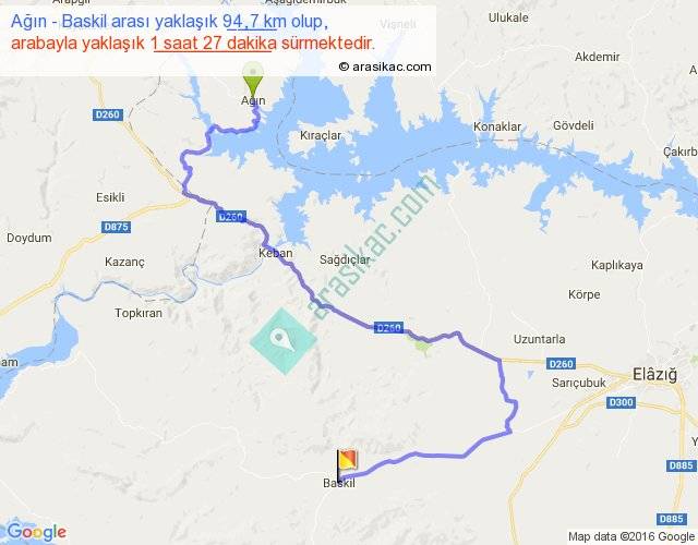 Ağın - Baskil arası yaklaşık olarak 90 km/h ile yukarıda belirtilen sürede olup, iki yerin kuş uçuşu uzaklığı (mesafesi) 43'dir. Yolculuk otobüsle 1 saat 53 dakika sürmektedir.