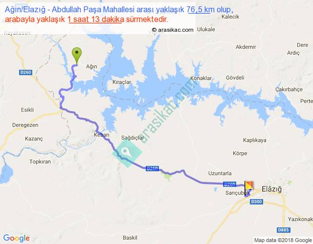 Ağın Elazığ - Abdullah Paşa Mahallesi arası yaklaşık olarak 90 km/h ile yukarıda belirtilen sürede olup, iki yerin kuş uçuşu uzaklığı (mesafesi) 52'dir. Yolculuk otobüsle 1 saat 34 dakika sürmektedir.