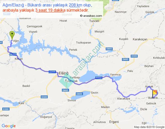 Ağın Elazığ - Bükardı arası yaklaşık olarak 90 km/h ile yukarıda belirtilen sürede olup, iki yerin kuş uçuşu uzaklığı (mesafesi) 140'dir. Yolculuk otobüsle 4 saat 18 dakika sürmektedir.