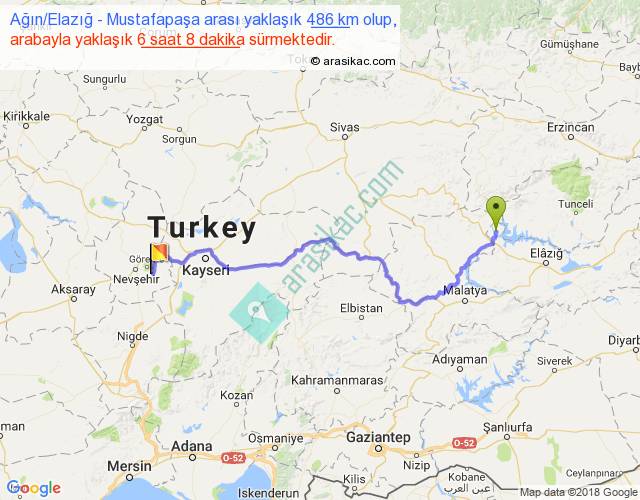 Ağın Elazığ - Mustafapaşa arası yaklaşık olarak 90 km/h ile yukarıda belirtilen sürede olup, iki yerin kuş uçuşu uzaklığı (mesafesi) 328'dir. Eğer belirtilen yerler arasında uçak seferi var ise bu süre uçakla 30 dakika'ya kadar düşebilir. Yolculuk otobüsle 7 saat 58 dakika sürmektedir.