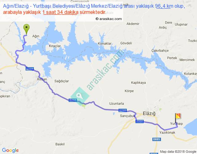Ağın Elazığ - Yurtbaşı Belediyesi Elâzığ Merkez Elazığ arası yaklaşık olarak 90 km/h ile yukarıda belirtilen sürede olup, iki yerin kuş uçuşu uzaklığı (mesafesi) 67'dir. Yolculuk otobüsle 2 saat 2 dakika sürmektedir.