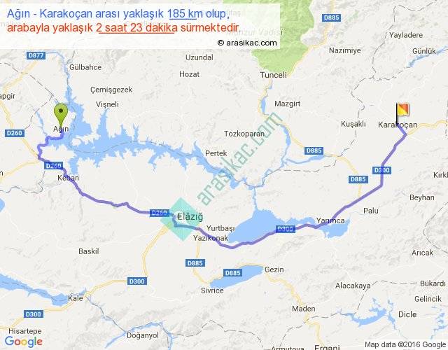 Ağın - Karakoçan arası yaklaşık olarak 90 km/h ile yukarıda belirtilen sürede olup, iki yerin kuş uçuşu uzaklığı (mesafesi) 114'dir. Yolculuk otobüsle 3 saat 5 dakika sürmektedir.