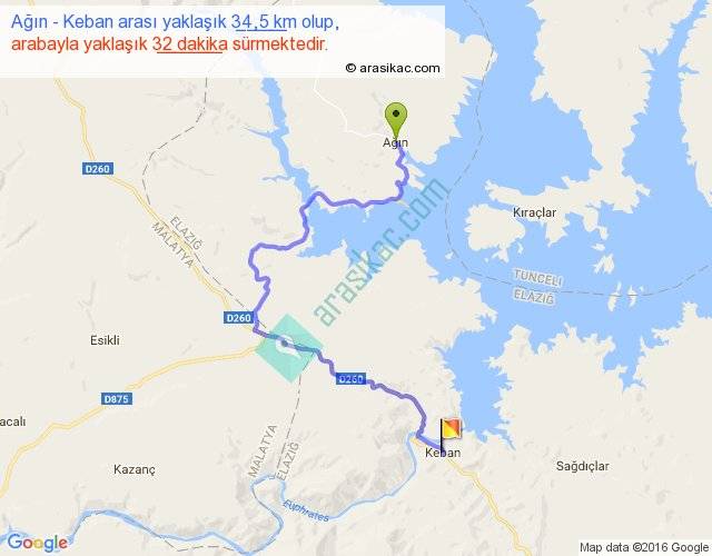 Ağın - Keban arası yaklaşık olarak 90 km/h ile yukarıda belirtilen sürede olup, iki yerin kuş uçuşu uzaklığı (mesafesi) 17'dir. Yolculuk otobüsle 41 dakika sürmektedir.