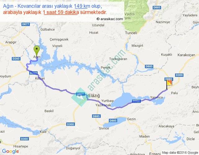 Ağın - Kovancılar arası yaklaşık olarak 90 km/h ile yukarıda belirtilen sürede olup, iki yerin kuş uçuşu uzaklığı (mesafesi) 102'dir. Yolculuk otobüsle 2 saat 34 dakika sürmektedir.
