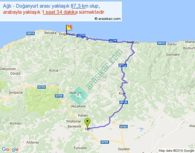 Ağlı - Doğanyurt arası yaklaşık olarak 90 km/h ile yukarıda belirtilen sürede olup, iki yerin kuş uçuşu uzaklığı (mesafesi) 36'dir. Yolculuk otobüsle 2 saat 2 dakika sürmektedir.