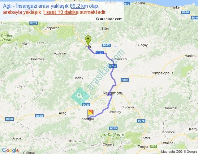 Ağlı - İhsangazi arası yaklaşık olarak 90 km/h ile yukarıda belirtilen sürede olup, iki yerin kuş uçuşu uzaklığı (mesafesi) 53'dir. Yolculuk otobüsle 1 saat 31 dakika sürmektedir.