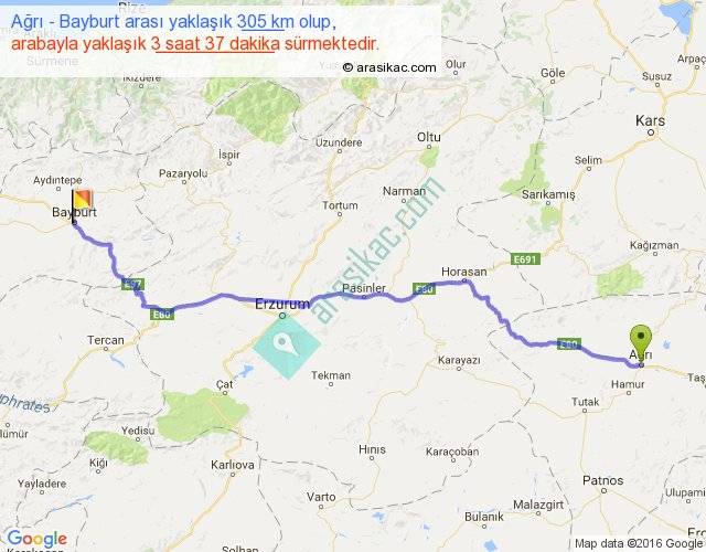 Ağrı - Bayburt arası yaklaşık olarak 90 km/h ile yukarıda belirtilen sürede olup, iki yerin kuş uçuşu uzaklığı (mesafesi) 246'dir. Yolculuk otobüsle 4 saat 42 dakika sürmektedir.