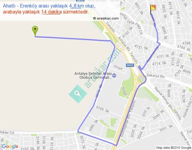 Ahatlı - Erenköy arası yaklaşık olarak 90 km/h ile yukarıda belirtilen sürede olup, iki yerin kuş uçuşu uzaklığı (mesafesi) 1'dir. Yolculuk otobüsle 18 dakika sürmektedir.