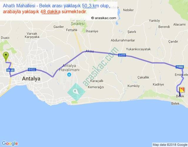 Ahatlı Mahallesi - Belek arası yaklaşık olarak 90 km/h ile yukarıda belirtilen sürede olup, iki yerin kuş uçuşu uzaklığı (mesafesi) 37'dir. Yolculuk otobüsle 1 saat 2 dakika sürmektedir.