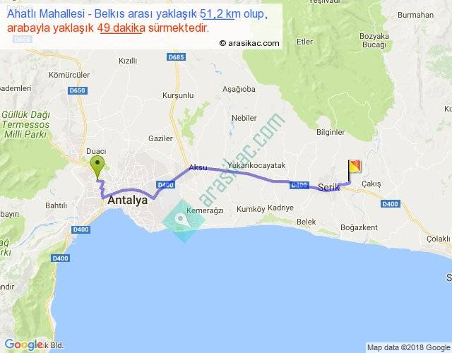 Ahatlı Mahallesi - Belkıs arası yaklaşık olarak 90 km/h ile yukarıda belirtilen sürede olup, iki yerin kuş uçuşu uzaklığı (mesafesi) 43'dir. Yolculuk otobüsle 1 saat 3 dakika sürmektedir.