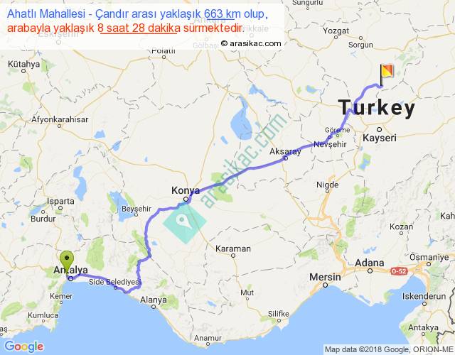Ahatlı Mahallesi - Çandır arası yaklaşık olarak 90 km/h ile yukarıda belirtilen sürede olup, iki yerin kuş uçuşu uzaklığı (mesafesi) 494'dir. Eğer belirtilen yerler arasında uçak seferi var ise bu süre uçakla 45 dakika'ya kadar düşebilir. Yolculuk otobüsle 11 saat 0 dakika sürmektedir.