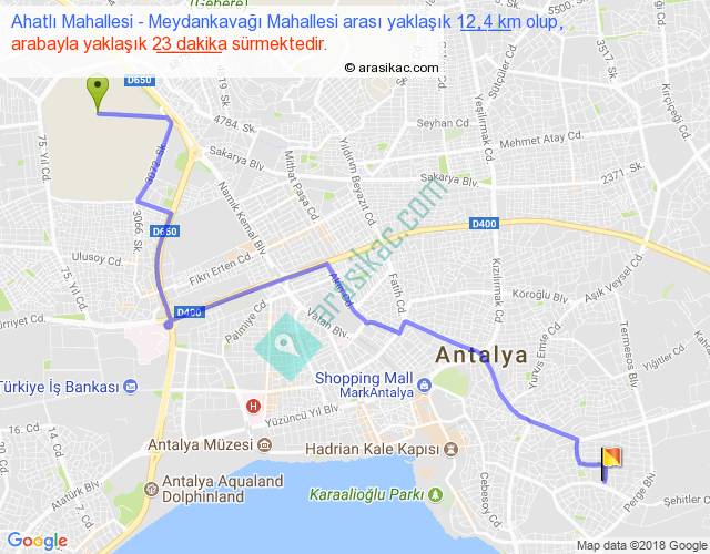 Ahatlı Mahallesi - Meydankavağı Mahallesi arası yaklaşık olarak 90 km/h ile yukarıda belirtilen sürede olup, iki yerin kuş uçuşu uzaklığı (mesafesi) 9'dir. Yolculuk otobüsle 29 dakika sürmektedir.