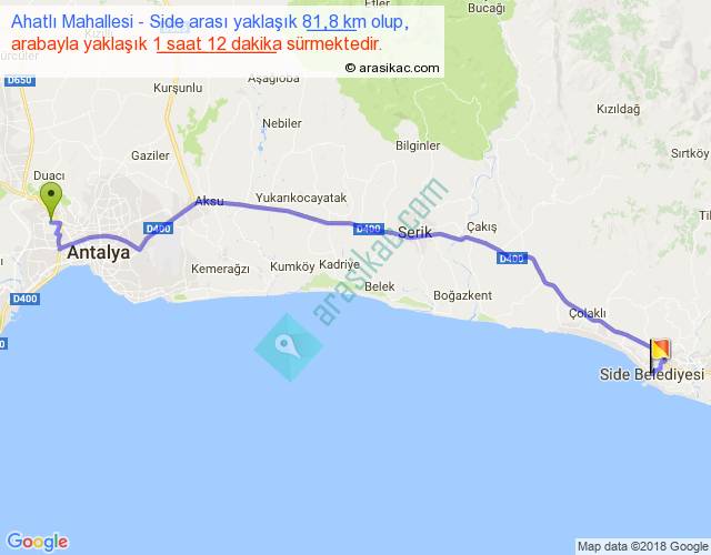 Ahatlı Mahallesi - Side arası yaklaşık olarak 90 km/h ile yukarıda belirtilen sürede olup, iki yerin kuş uçuşu uzaklığı (mesafesi) 68'dir. Yolculuk otobüsle 1 saat 33 dakika sürmektedir.