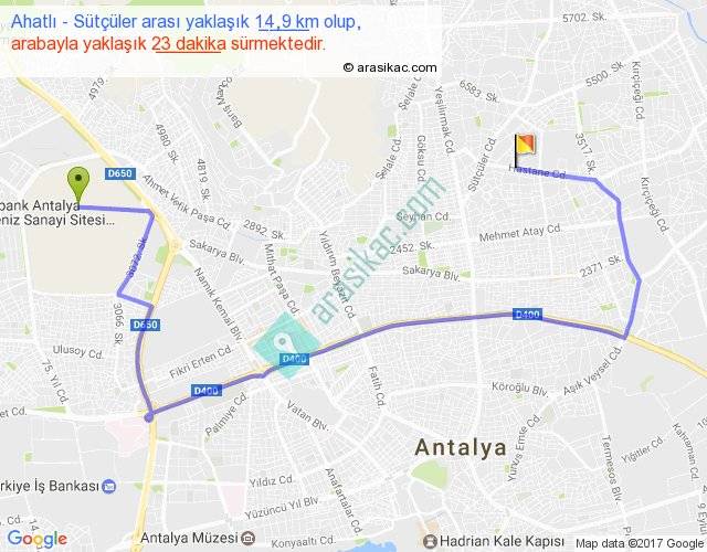 Ahatlı - Sütçüler arası yaklaşık olarak 90 km/h ile yukarıda belirtilen sürede olup, iki yerin kuş uçuşu uzaklığı (mesafesi) 6'dir. Yolculuk otobüsle 29 dakika sürmektedir.