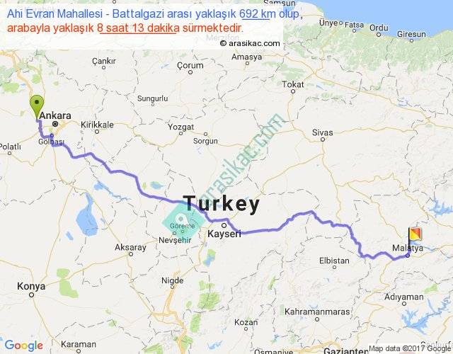Ahi Evran Mahallesi - Battalgazi arası yaklaşık olarak 90 km/h ile yukarıda belirtilen sürede olup, iki yerin kuş uçuşu uzaklığı (mesafesi) 525'dir. Eğer belirtilen yerler arasında uçak seferi var ise bu süre uçakla 48 dakika'ya kadar düşebilir. Yolculuk otobüsle 10 saat 40 dakika sürmektedir.
