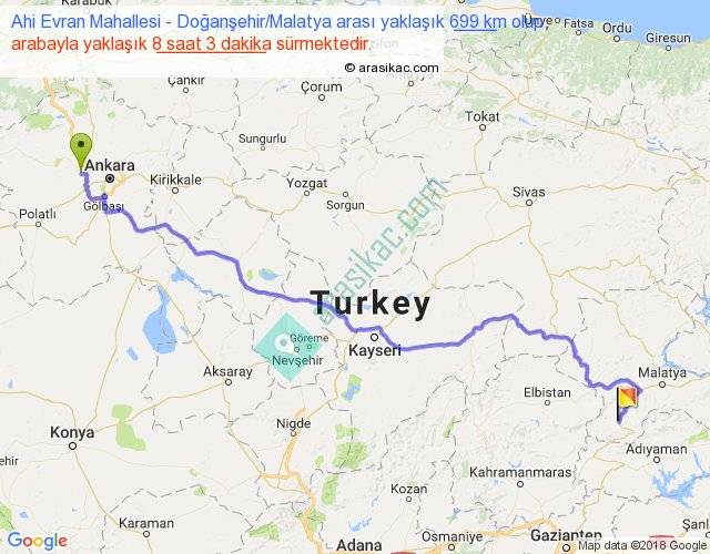 Ahi Evran Mahallesi - Doğanşehir Malatya arası yaklaşık olarak 90 km/h ile yukarıda belirtilen sürede olup, iki yerin kuş uçuşu uzaklığı (mesafesi) 504'dir. Eğer belirtilen yerler arasında uçak seferi var ise bu süre uçakla 46 dakika'ya kadar düşebilir. Yolculuk otobüsle 10 saat 27 dakika sürmektedir.