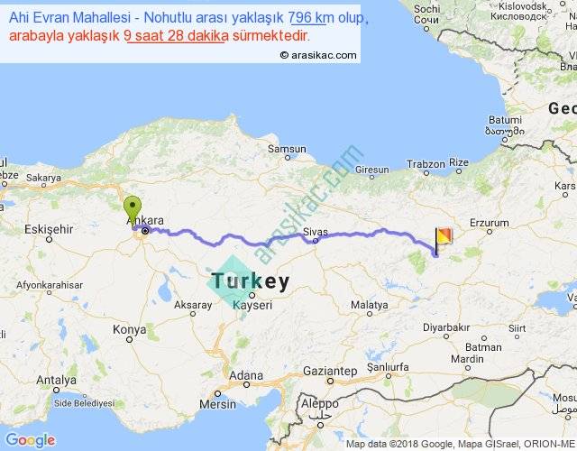 Ahi Evran Mahallesi - Nohutlu arası yaklaşık olarak 90 km/h ile yukarıda belirtilen sürede olup, iki yerin kuş uçuşu uzaklığı (mesafesi) 632'dir. Eğer belirtilen yerler arasında uçak seferi var ise bu süre uçakla 58 dakika'ya kadar düşebilir. Yolculuk otobüsle 12 saat 18 dakika sürmektedir.