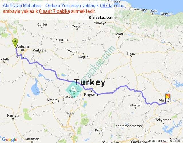 Ahi Evran Mahallesi - Orduzu Yolu arası yaklaşık olarak 90 km/h ile yukarıda belirtilen sürede olup, iki yerin kuş uçuşu uzaklığı (mesafesi) 526'dir. Eğer belirtilen yerler arasında uçak seferi var ise bu süre uçakla 48 dakika'ya kadar düşebilir. Yolculuk otobüsle 10 saat 33 dakika sürmektedir.