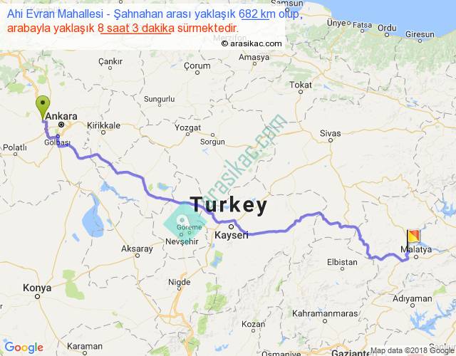 Ahi Evran Mahallesi - Şahnahan arası yaklaşık olarak 90 km/h ile yukarıda belirtilen sürede olup, iki yerin kuş uçuşu uzaklığı (mesafesi) 513'dir. Eğer belirtilen yerler arasında uçak seferi var ise bu süre uçakla 47 dakika'ya kadar düşebilir. Yolculuk otobüsle 10 saat 27 dakika sürmektedir.