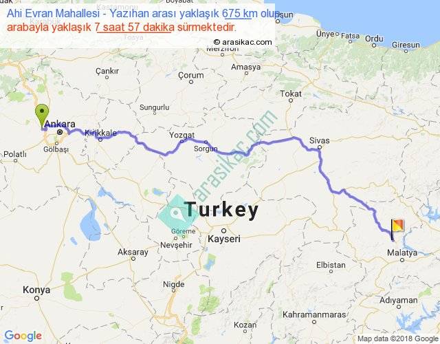 Ahi Evran Mahallesi - Yazıhan arası yaklaşık olarak 90 km/h ile yukarıda belirtilen sürede olup, iki yerin kuş uçuşu uzaklığı (mesafesi) 503'dir. Eğer belirtilen yerler arasında uçak seferi var ise bu süre uçakla 46 dakika'ya kadar düşebilir. Yolculuk otobüsle 10 saat 20 dakika sürmektedir.